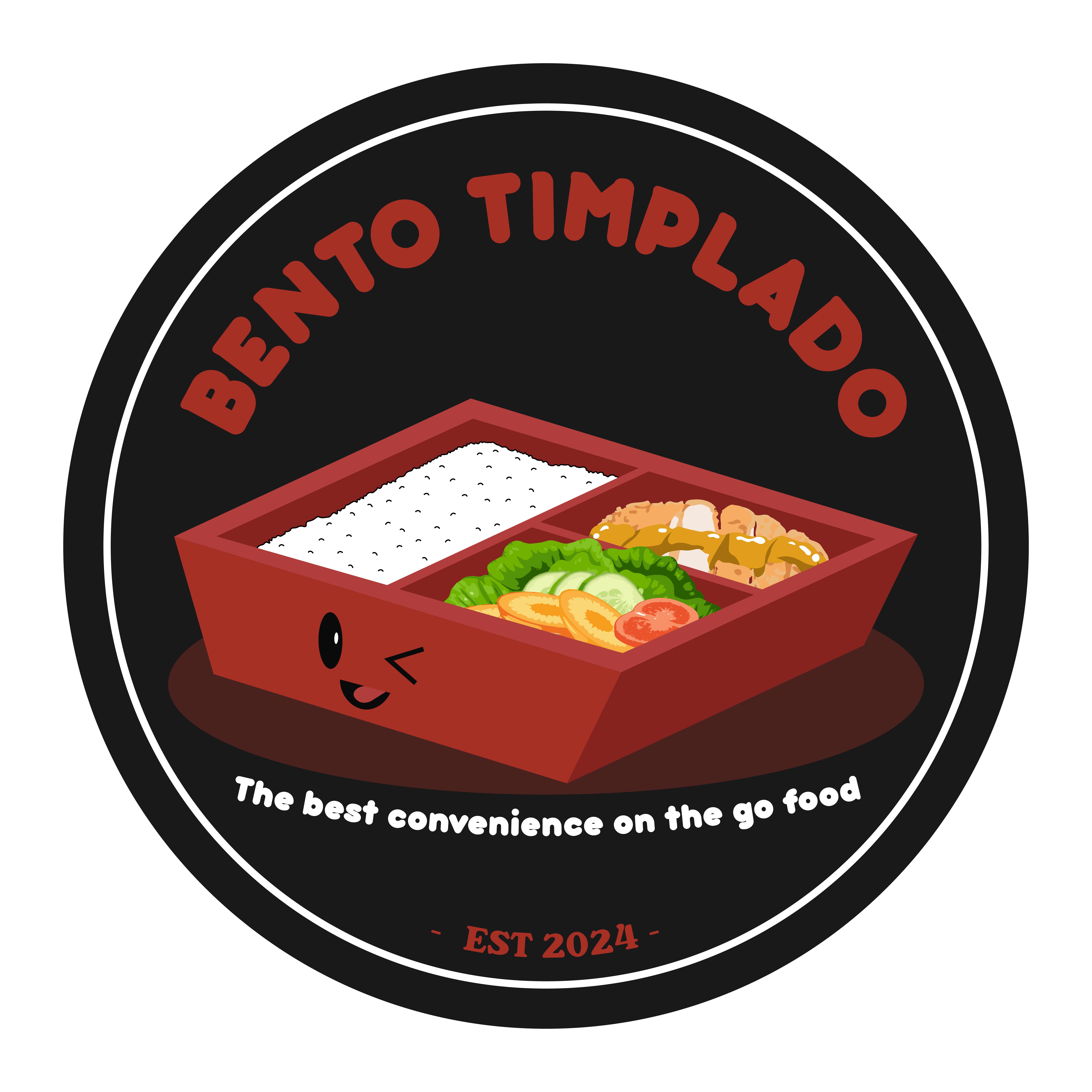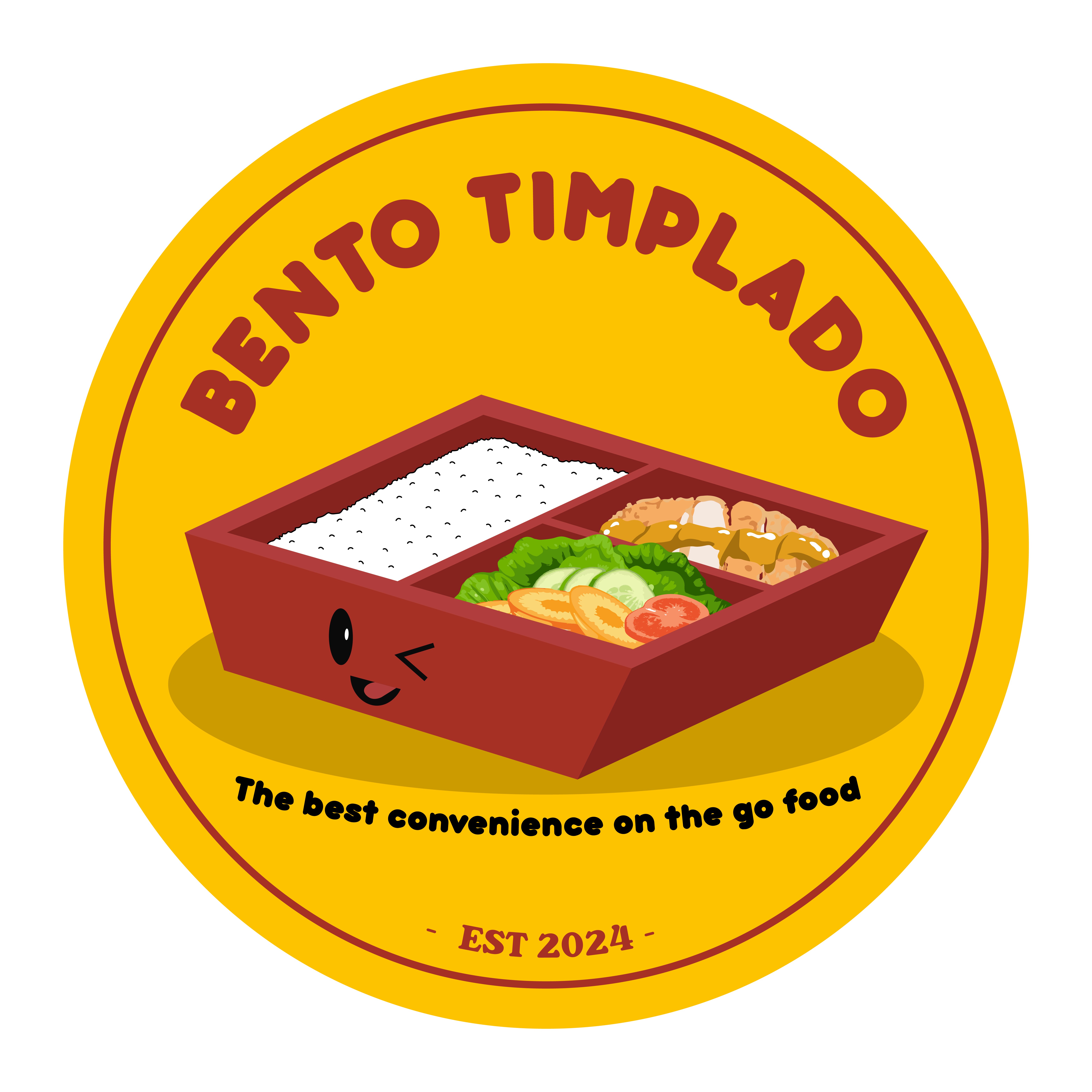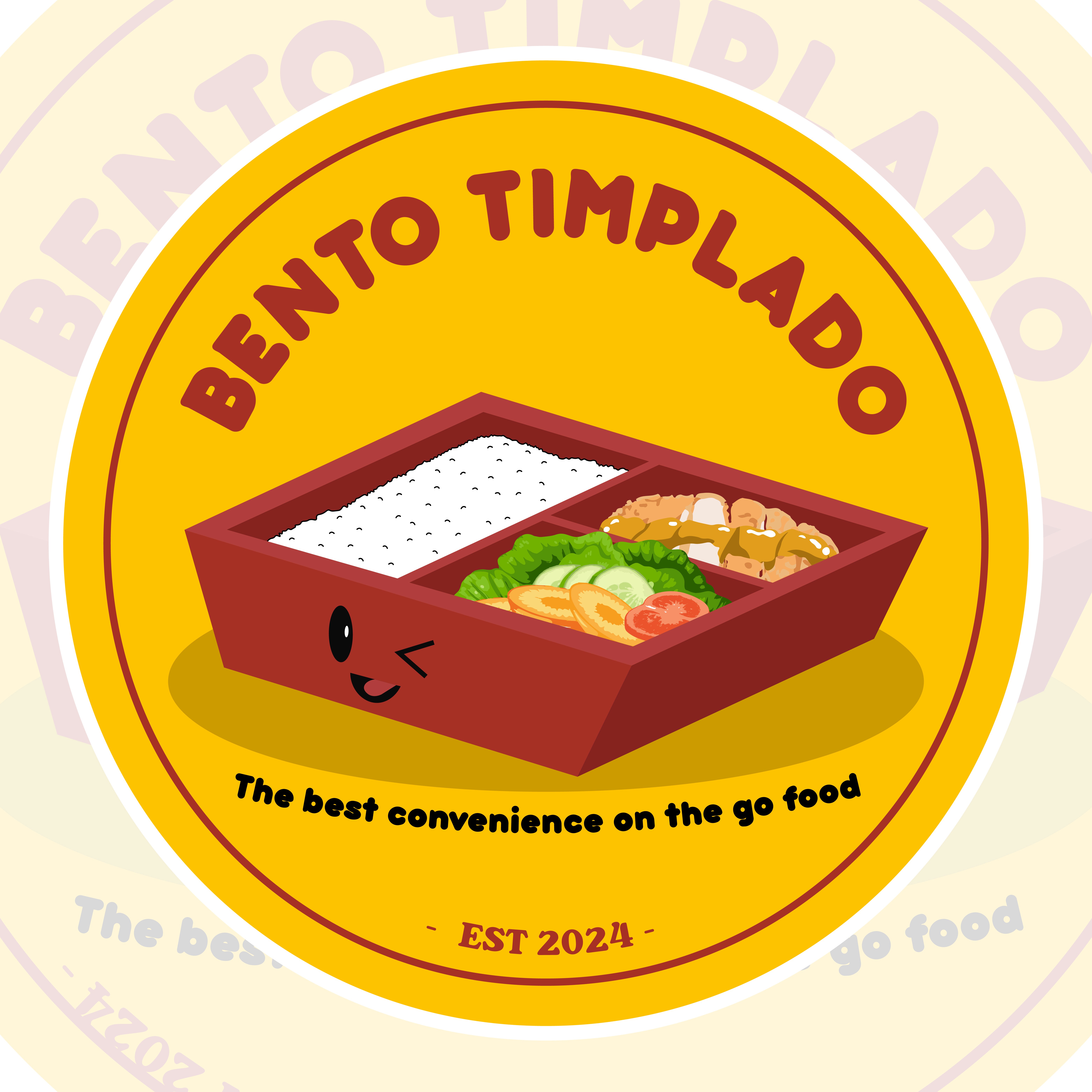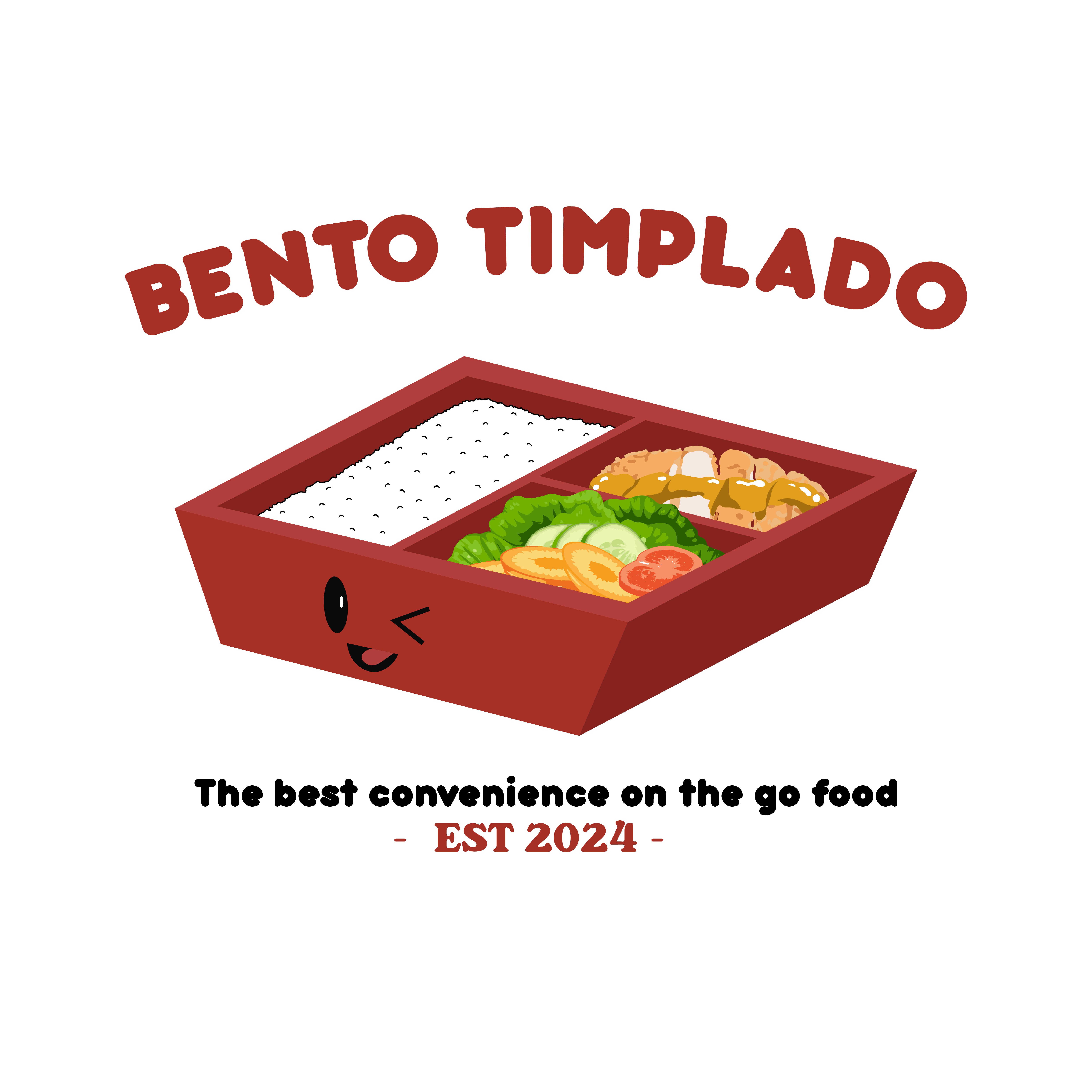 “The best convenience on the go food.” EST - 2024 The concept of the “Bento Timplado” logo can include a stylized bento box with various dishes nicely arranged inside, showing traditional and modern elements. The typography could be clean and bold to emphasize the brand, and the color scheme reflects the freshness and diversity of the food ingredients.